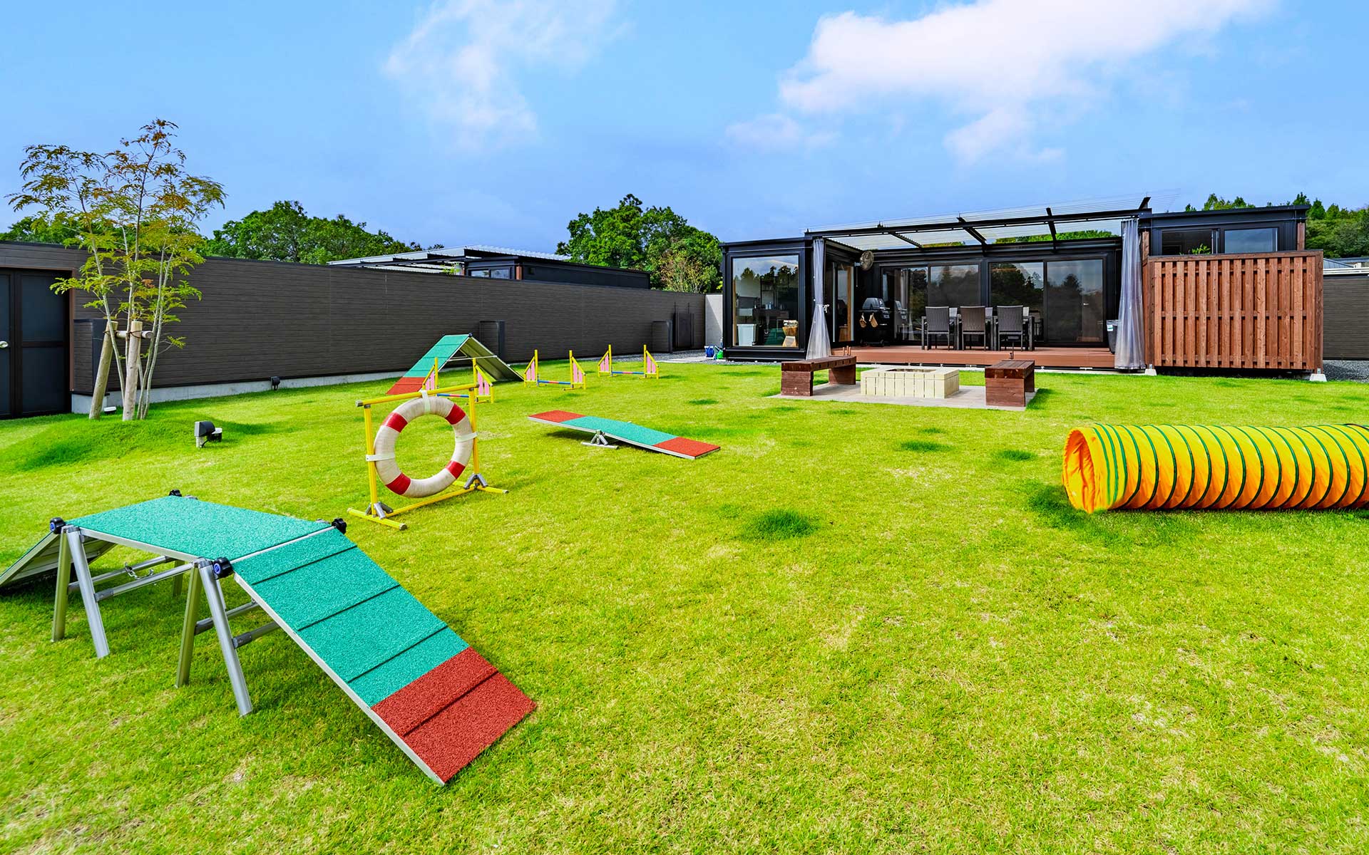 「GLAMPING CABIN 安心院」全4棟中僅有2棟為可攜帶寵物入住的套房小屋。 配備專屬寵物活動空間,讓愛犬亦能盡情奔跑,寵物友善的貼心設計。 無論犬種、體型或數量皆可入住。 請盡情享受與愛犬一同度過的夢幻豪華露營時光。