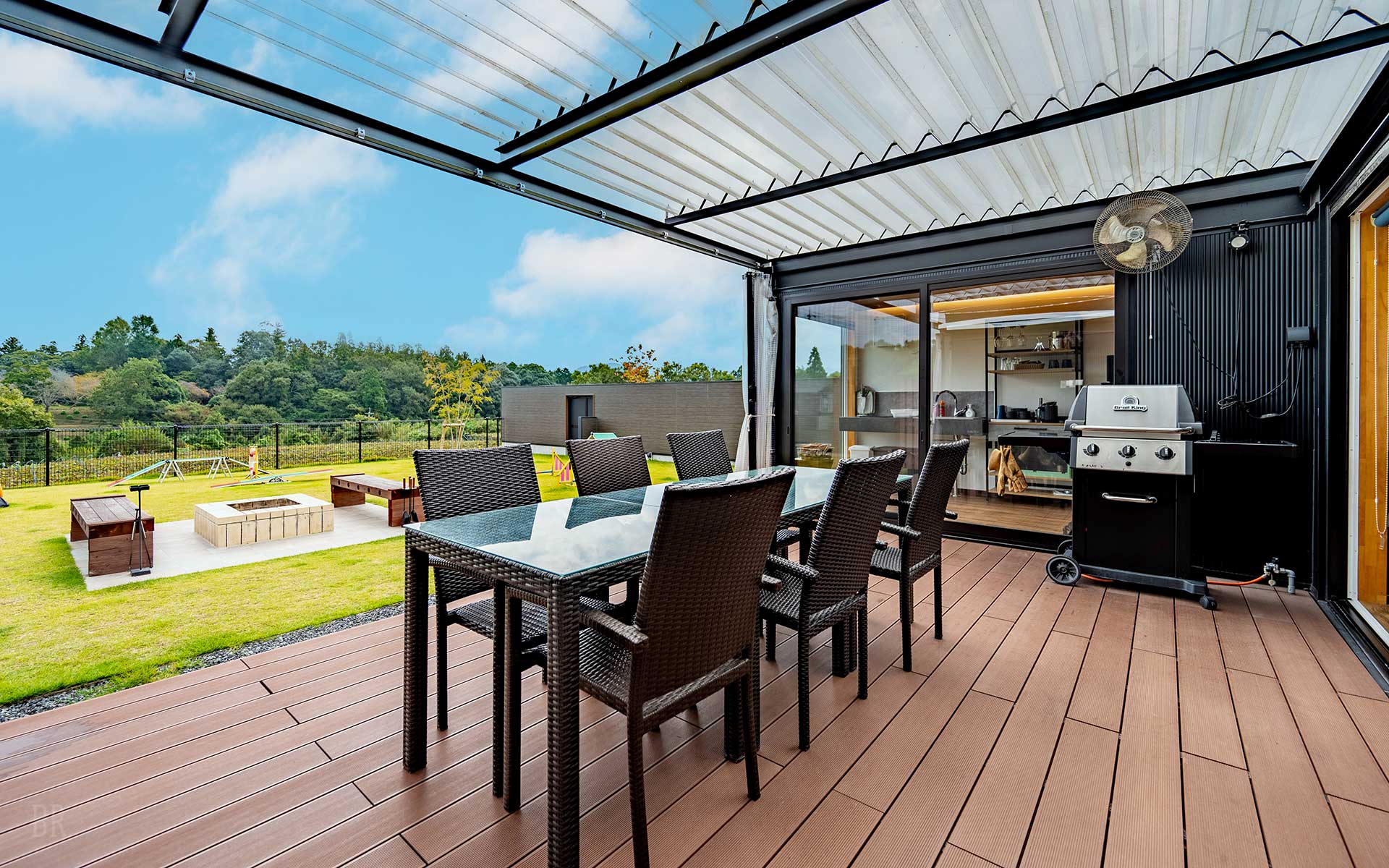 為了讓戶外活動新手、女性與小朋友也能無拘無束地享受豪華露營, 套房小屋提供完善的專屬設施及安心的完全私人空間。 每棟均設有專用廚房、浴室及廁所。 在套房小屋中央的木造平台上, 可於套房小屋中央的木造平台上,一邊感受從腳下葡萄園吹來的微風,一邊自在享受開放感十足的BBQ。