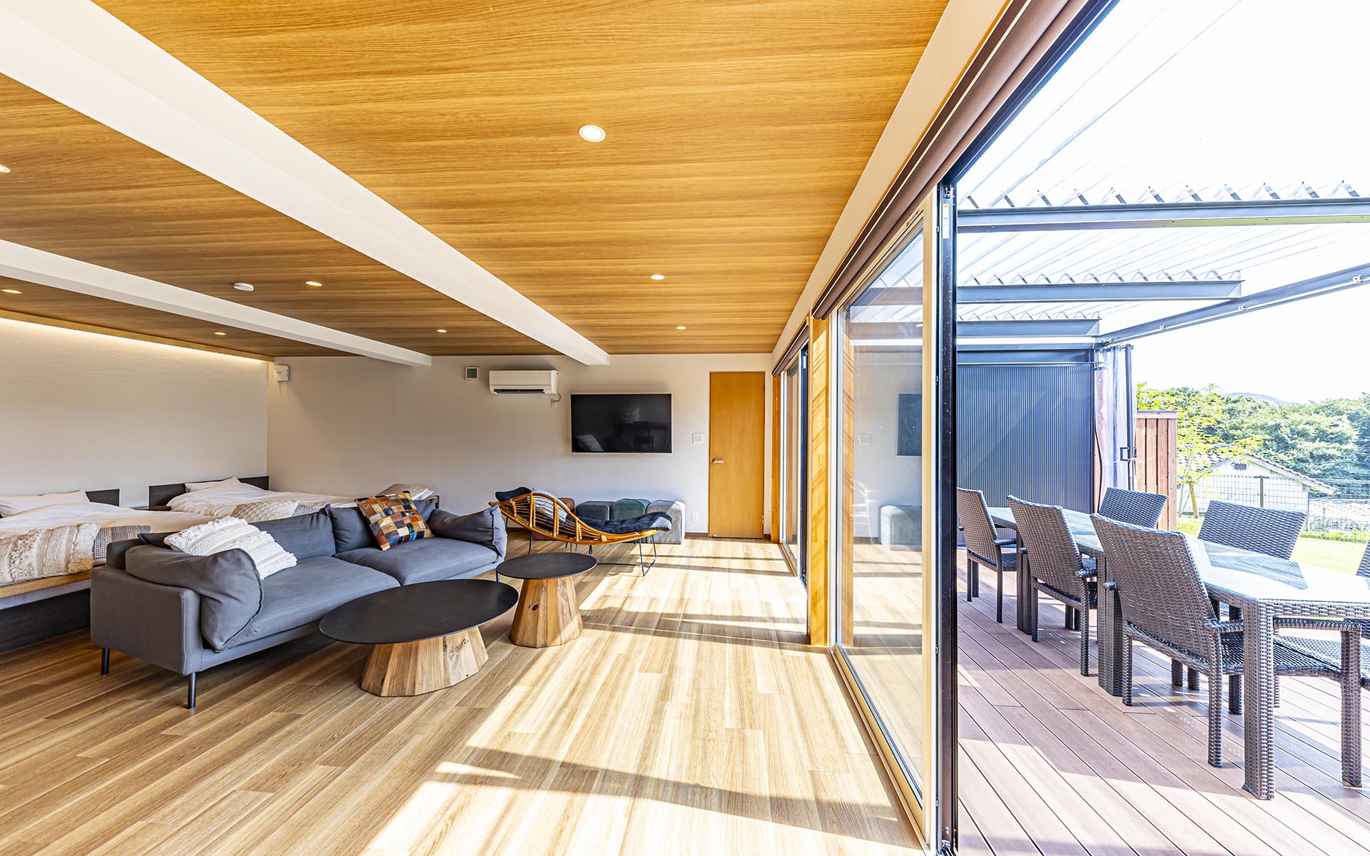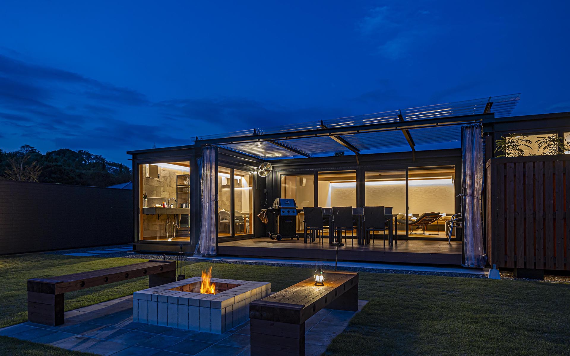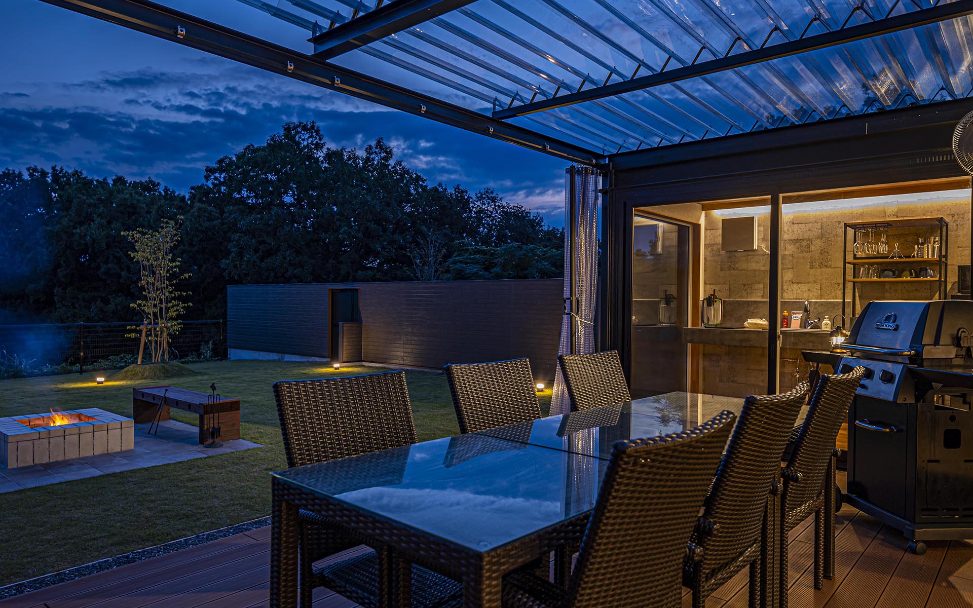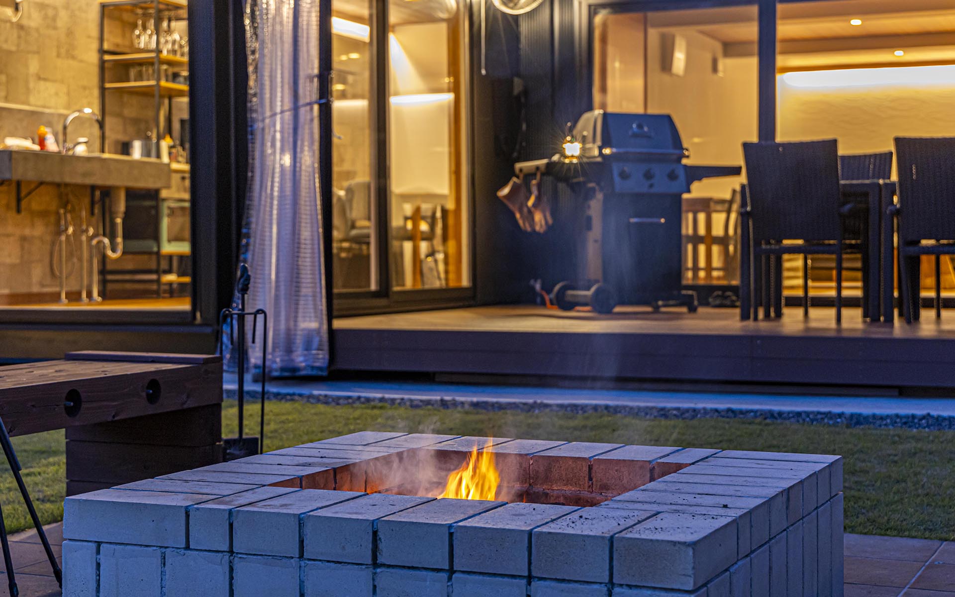 套房小屋中央的木造平台,是戶外風格十足的專屬戶外客廳。 白天可眺望安心院盆地的景致,夜晚仰望滿天繁星,清晨則沉醉於夢幻般的晨霧——這裡是專屬於你的私人天地。 寬敞的私人花園亦設有營火區,享受庭園樂趣, 是豪華露營及露營住宿的經典活動。 敬請投入這段被搖曳火光療癒的非日常時光。