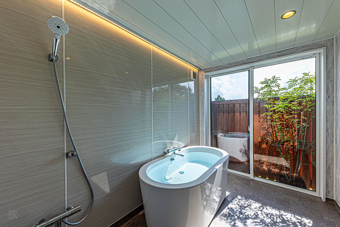 半露天風呂規格的浴槽設計,讓你在沐浴時感受從葡萄園吹來的微風,享受療癒時光。
